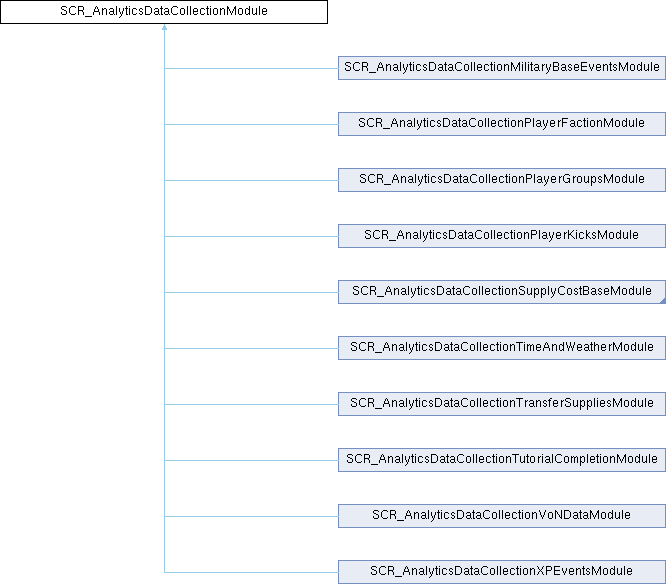 Implemented in SCR_AnalyticsDataCollectionAiGroupCostModule, SCR_AnalyticsDataCollectionCompositionCostModule, SCR_AnalyticsDataCollectionLoadoutCostModule, SCR_AnalyticsDataCollectionMilitaryBaseEventsModule, SCR_AnalyticsDataCollectionPlayerFactionModule, SCR_AnalyticsDataCollectionPlayerKicksModule, SCR_AnalyticsDataCollectionTransferSuppliesModule, SCR_AnalyticsDataCollectionTutorialCompletionModule, SCR_AnalyticsDataCollectionVehicleCostModule, SCR_AnalyticsDataCollectionVoNDataModule, and SCR_AnalyticsDataCollectionXPEventsModule.